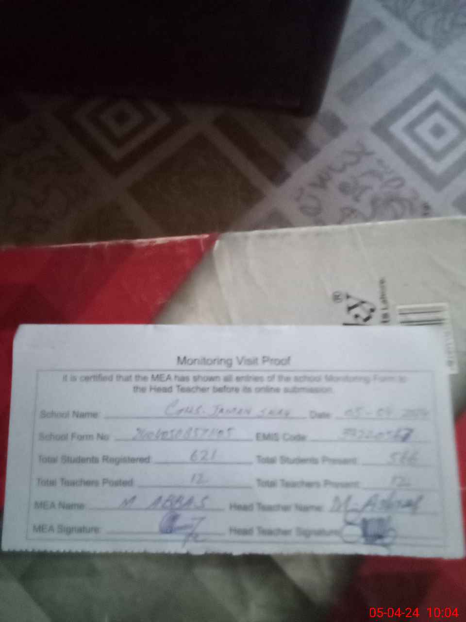 | Attendance Register | Head Teacher | MEA with School | Visit Proof |