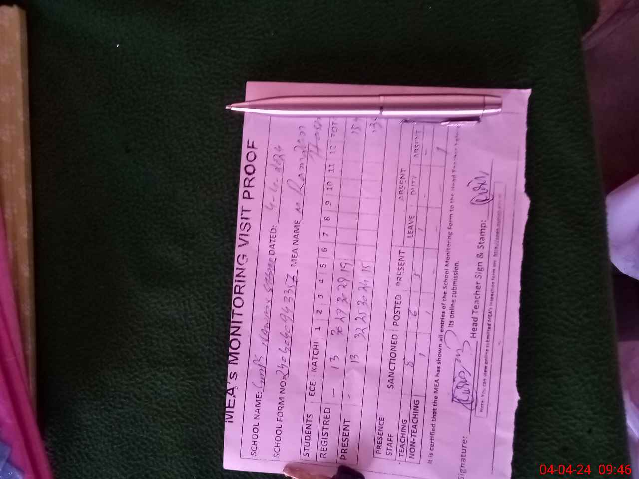 | Attendance Register | Head Teacher | MEA with School | Visit Proof |