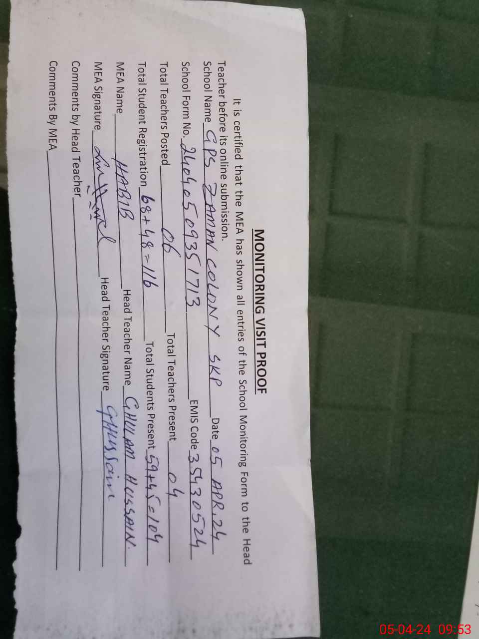 | Attendance Register | Head Teacher | MEA with School | Visit Proof |
