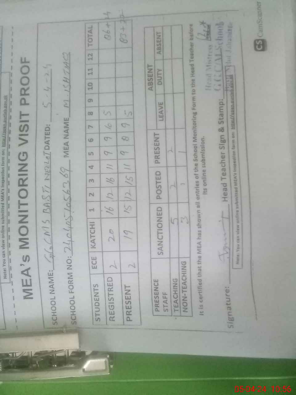 | Attendance Register | Head Teacher | MEA with School | Visit Proof |
