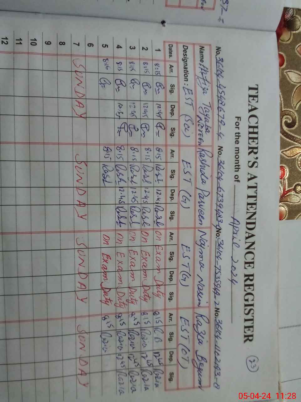 | 36**** | Na**** Na**** | Regular | 0 | 6 | 0 | 0 | 0 | 0 | 0 | 0 | 0 | Exam Duty | |