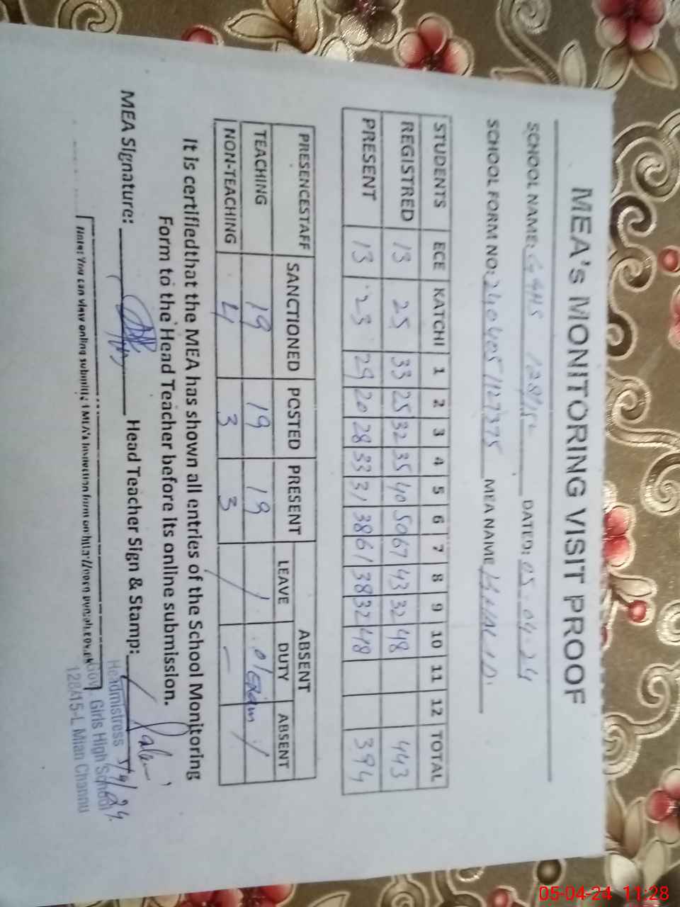 | Attendance Register | Head Teacher | MEA with School | Visit Proof |