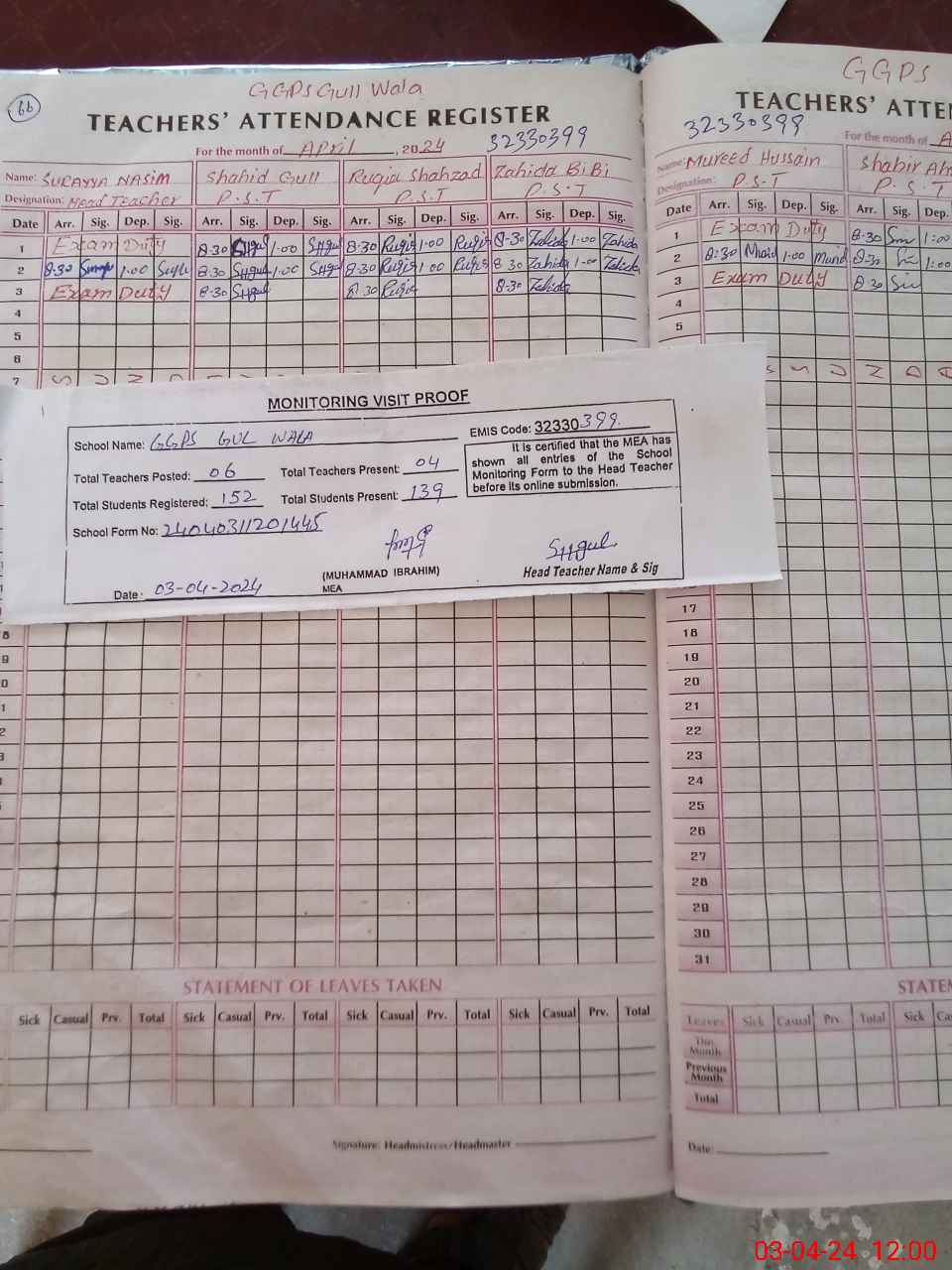 | Attendance Register | Head Teacher | MEA with School | Visit Proof |