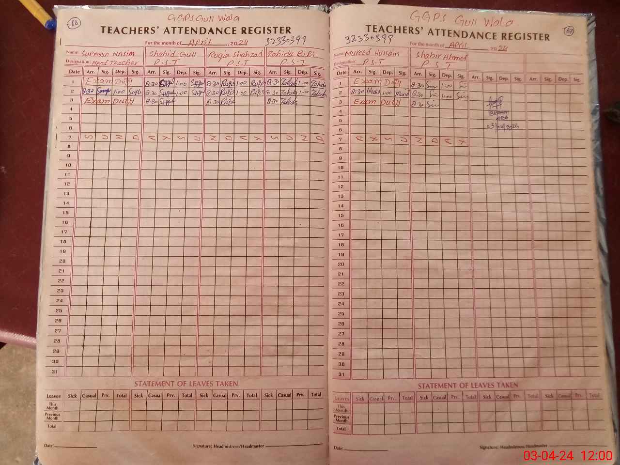| 32**** | Su**** Na**** | 1 | 1 | 0 | 0 | 0 | 0 | 0 | 0 | 0 | 0 | 0 | Exam Duty |
