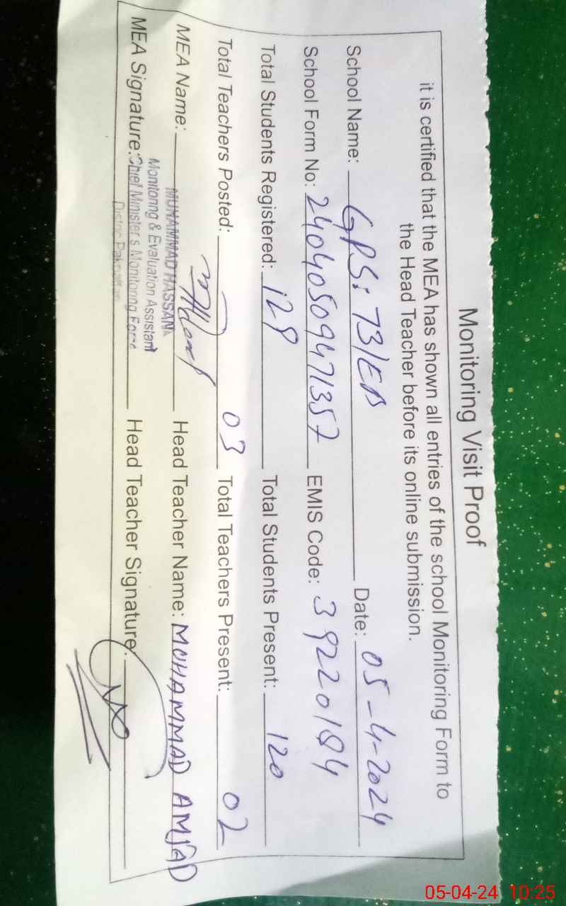 | EMIS Code: 39220184 | Name of School: GPS 73 EB P/O CHAK NO 75/EB | |||