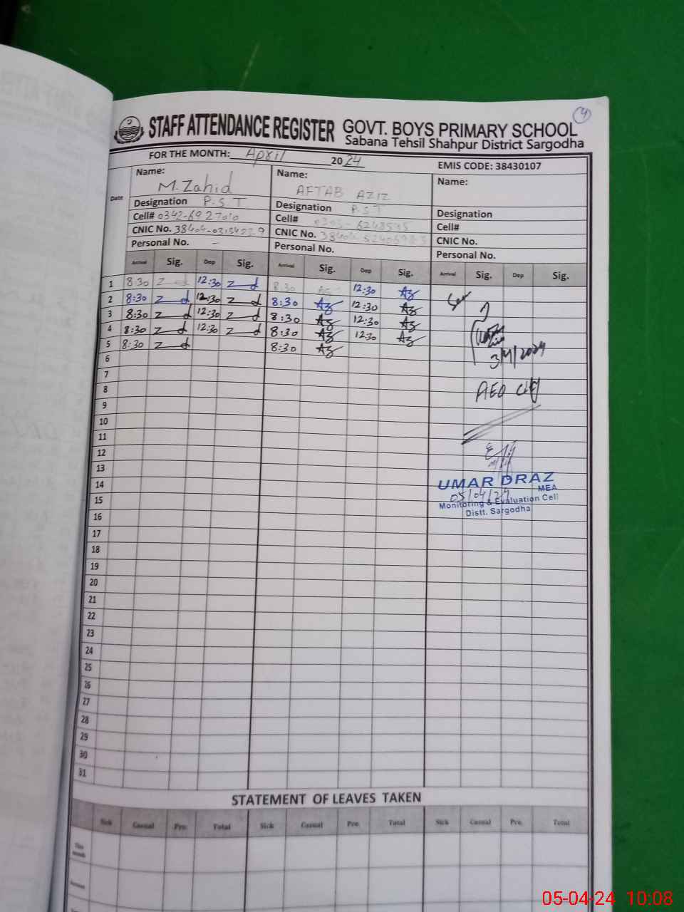 | Name: Af**** Az**** Designation: (School Headmaster's/Headmistress's) PST Phone/Cell Number: 03**** |