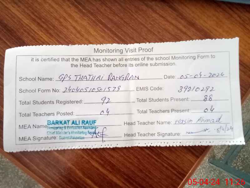 | EMIS Code: 39210292 | Name of School: GPS THATHAI RANGRAN P/O CHAK BEDI PAPATTAN | |||