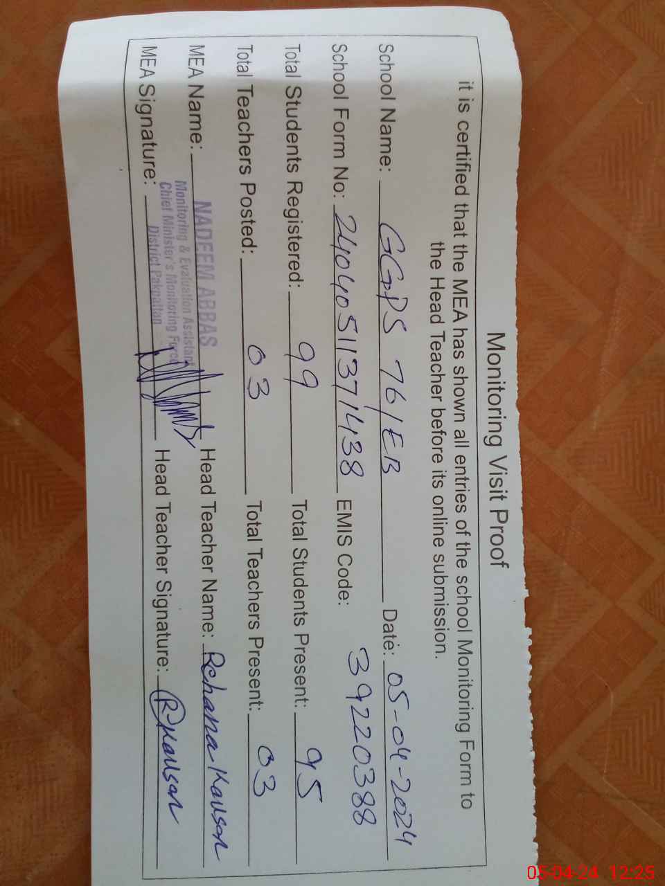 | EMIS Code: 39220388 | Name of School: GGPS 76 EB ARIFWALA | |||