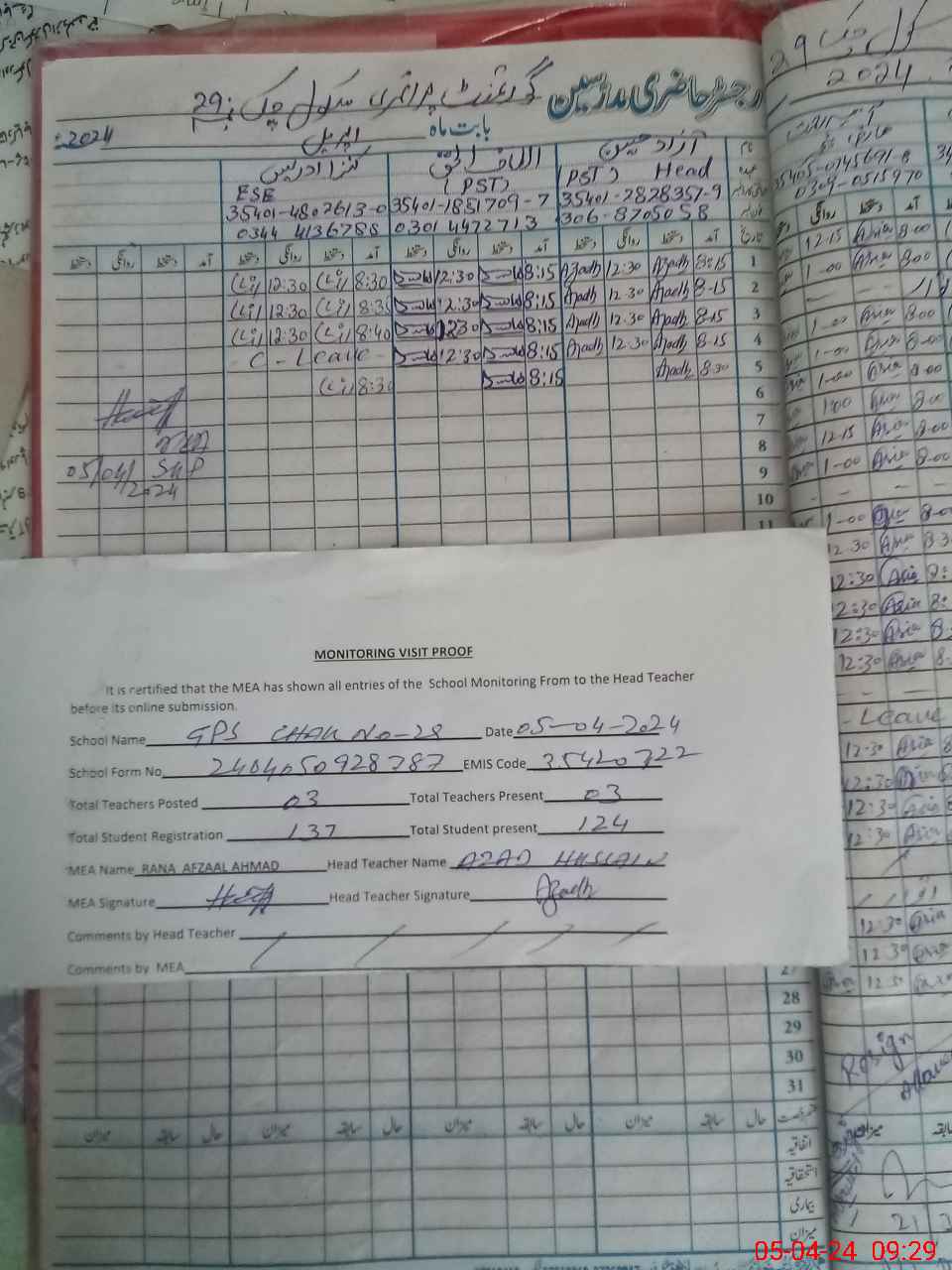 | Monitoring Date: 05-04-2024 | Start Time: 05-04-2024 08:53 AM | End Time: 05-04-2024 09:30 AM | Name of MEA: Ra**** Af**** Ah**** (R**** 25**** | |