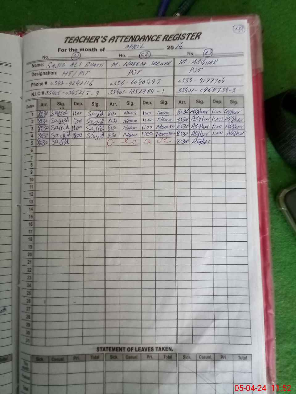 | CNIC | Full Name | Designation | R/C | Absence During Last Calender Month |
