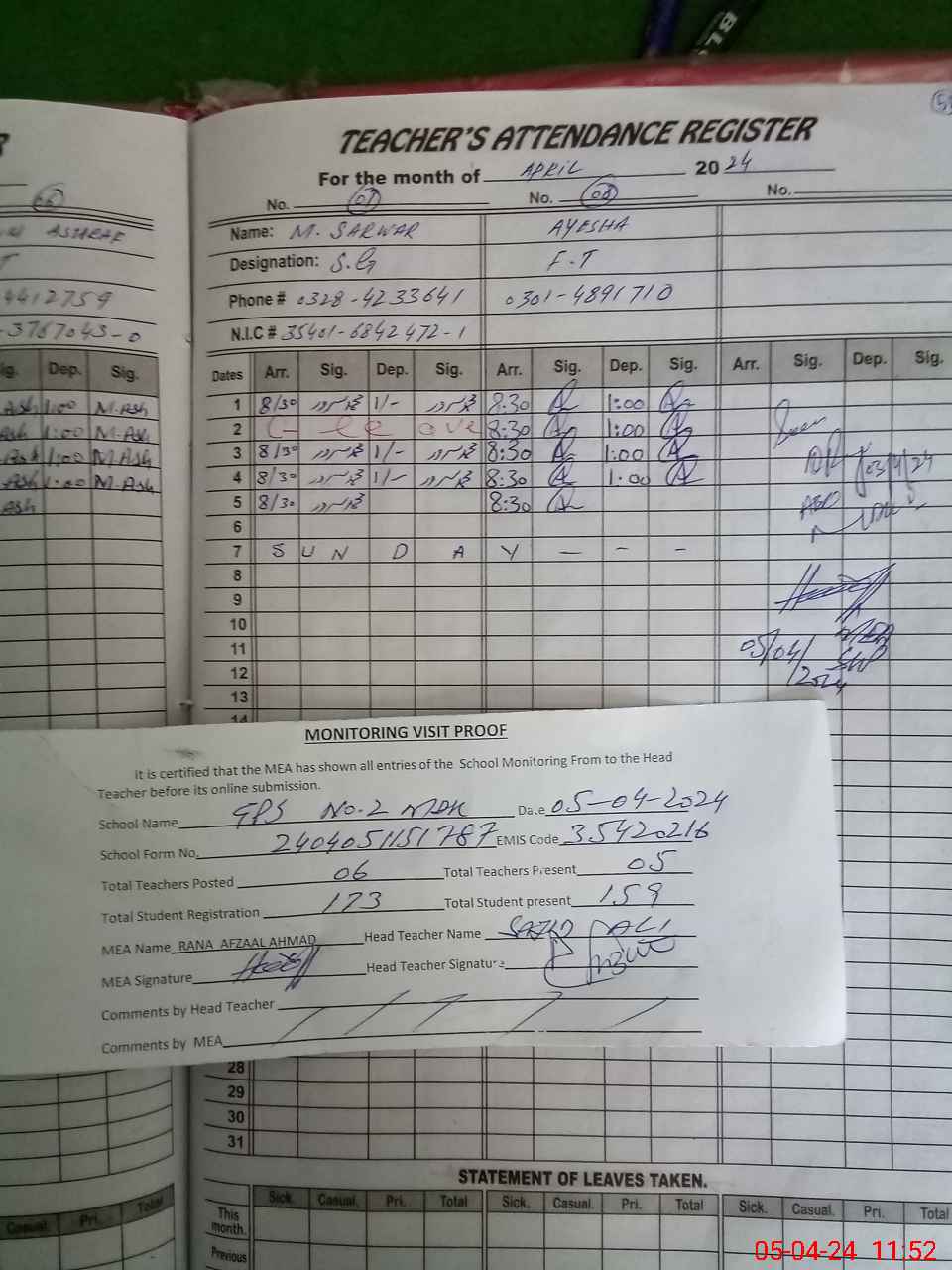 | Name: SA**** AL**** Designation: (School Headmaster's/Headmistress's) PST Phone/Cell Number: 03**** |