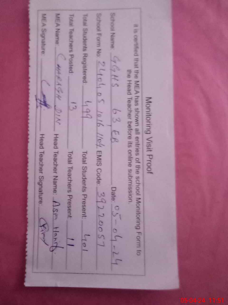 | Attendance Register | Head Teacher | MEA with School | Visit Proof |