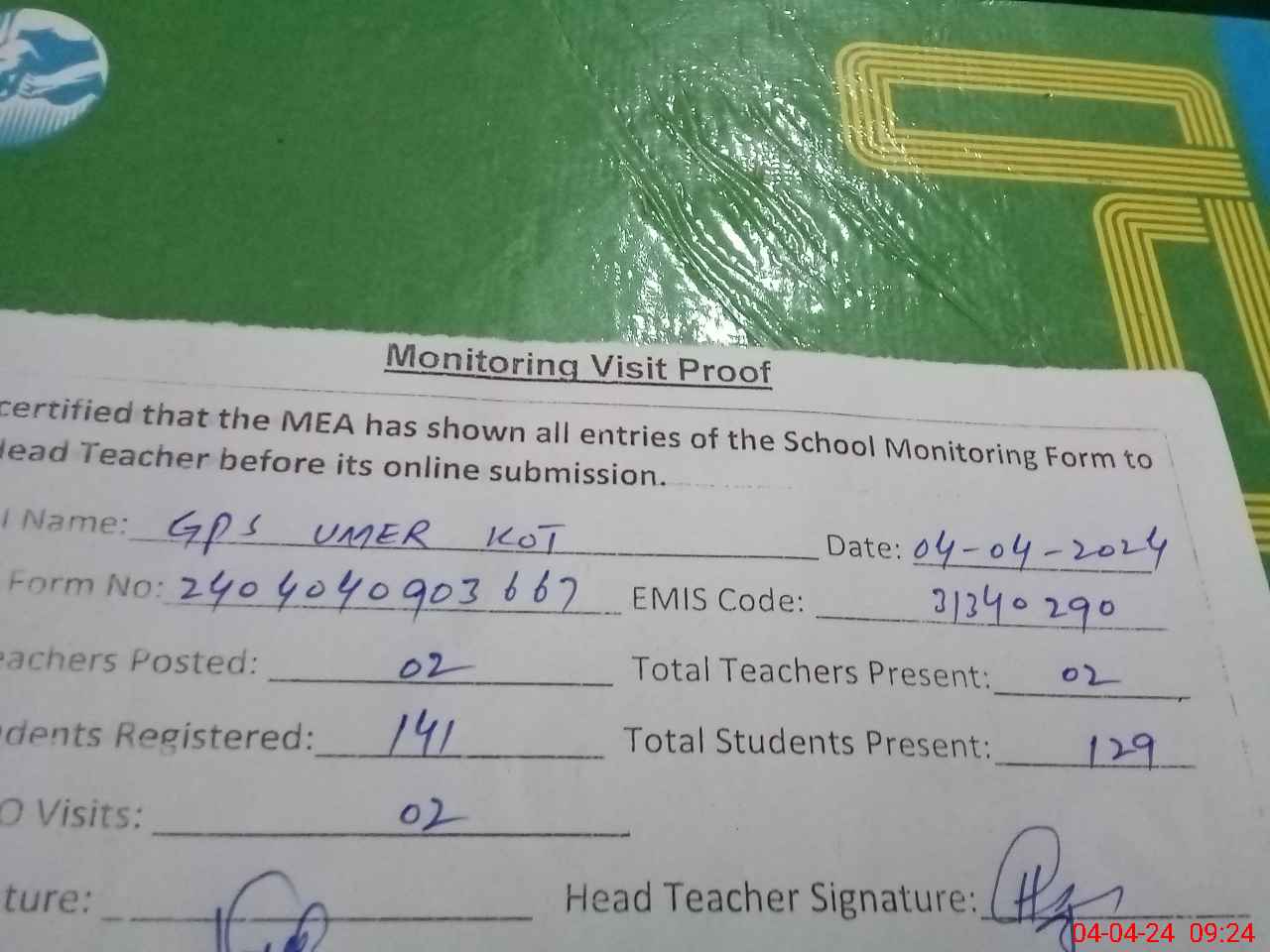 | Attendance Register | Head Teacher | MEA with School | Visit Proof |