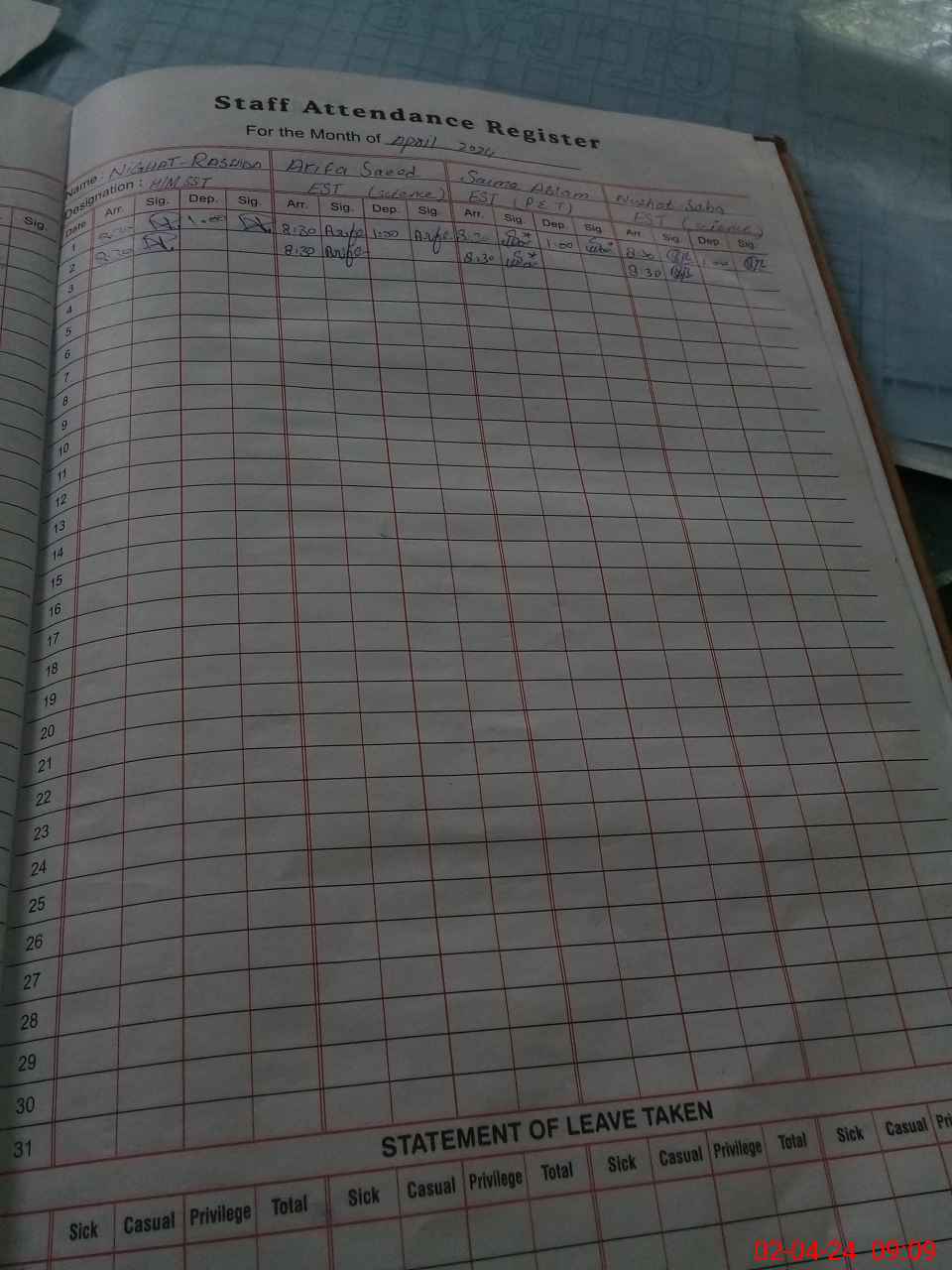 | CNIC | Full Name | Designation | R/C | Absence During Last Calender Month |