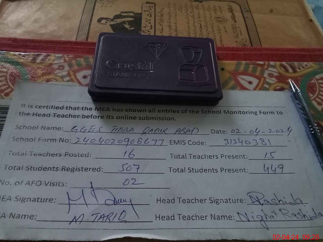 | Attendance Register | Head Teacher | MEA with School | Visit Proof |