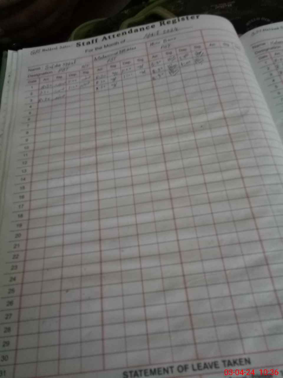 | Leave | Duty | Absent | Maternity | Medical | Ex- Pak |