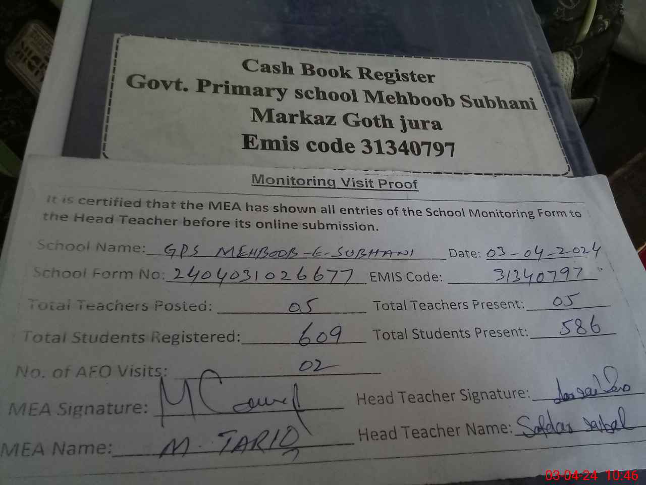 | Attendance Register | Head Teacher | MEA with School | Visit Proof |