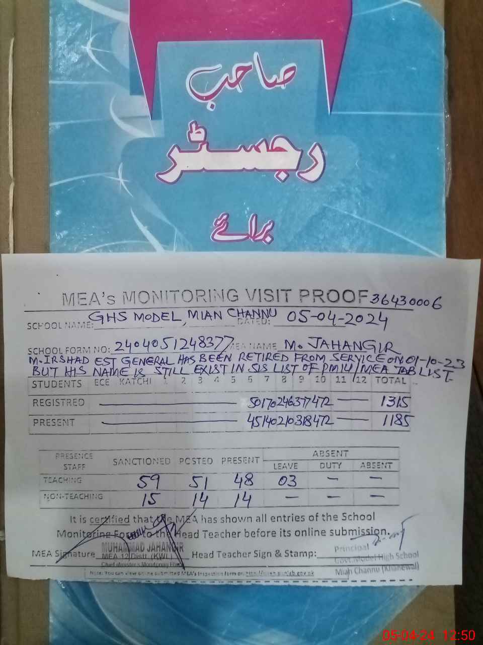 | EMIS Code: 36430006 | Name of School: GHS MODEL MIAN CHANNU | |||