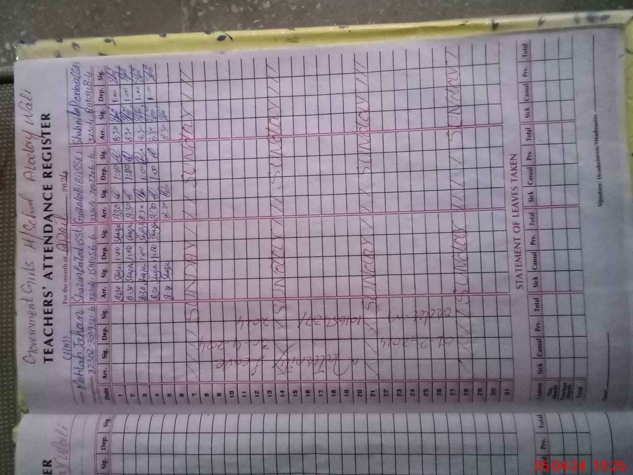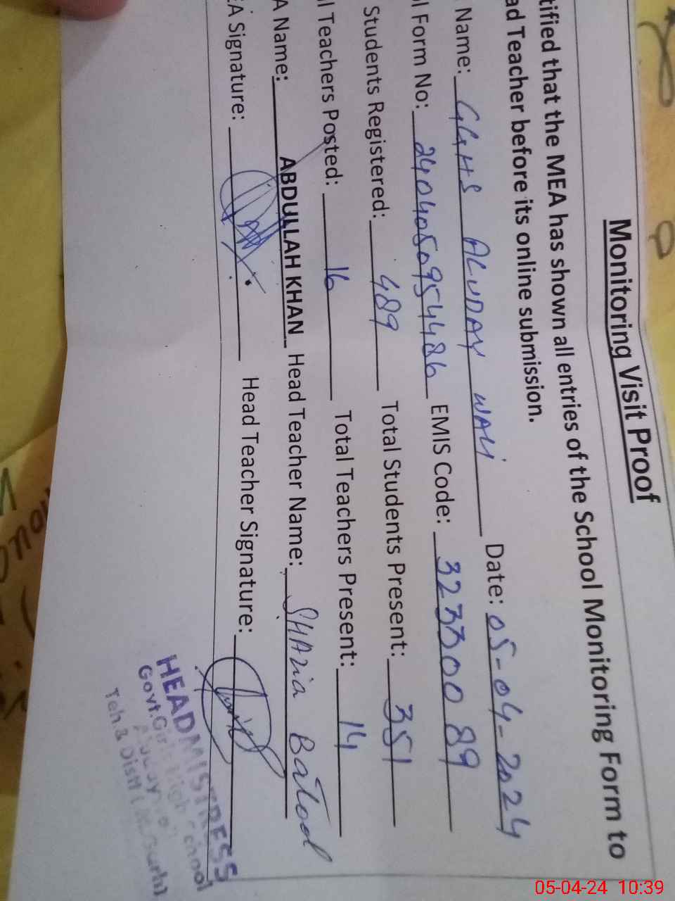 | EMIS Code: 32330089 | Name of School: GGHS ALODAY WALI | |||