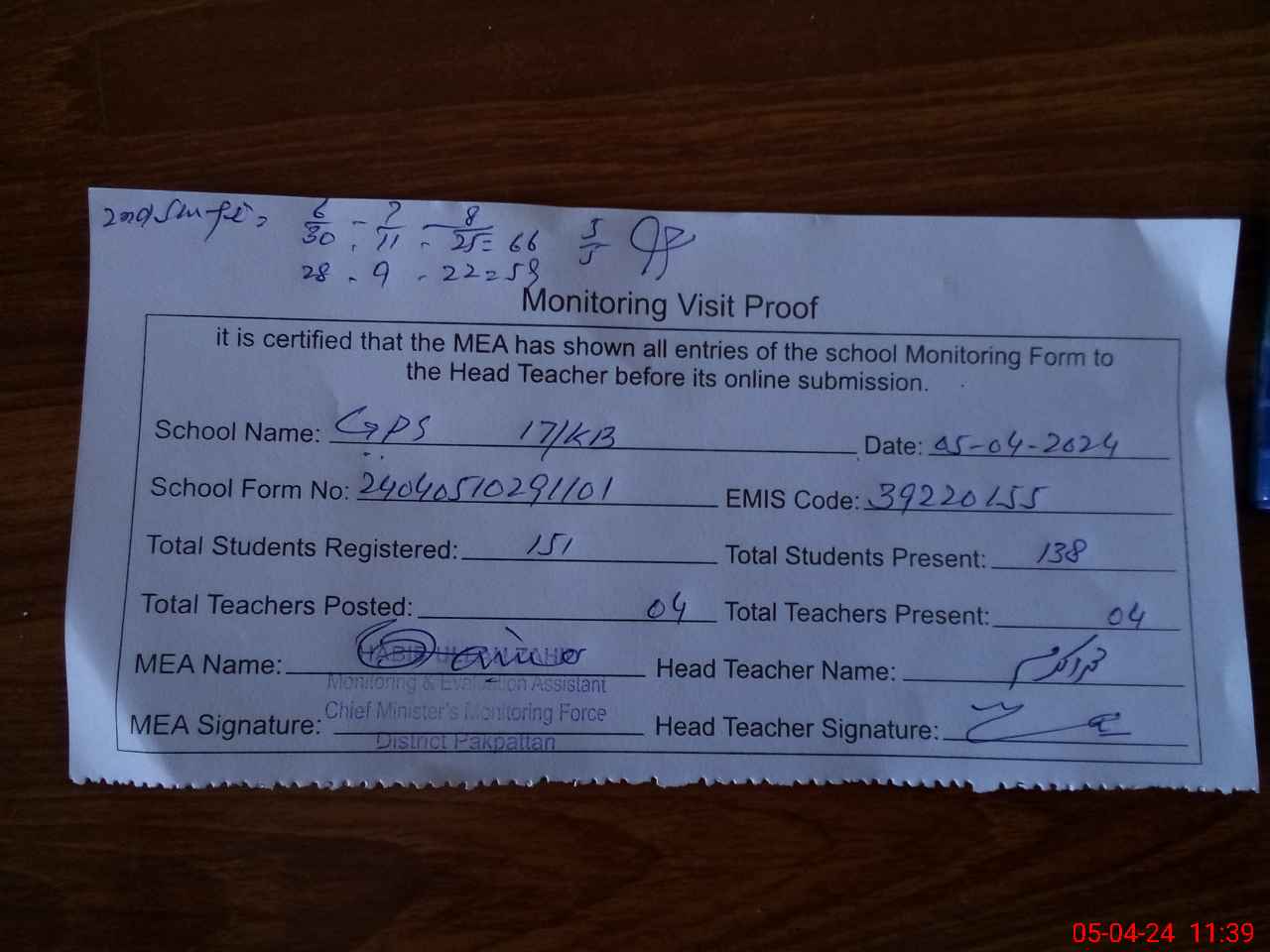 | EMIS Code: 39220155 | Name of School: GPS CHAK NO. 17 KB | |||