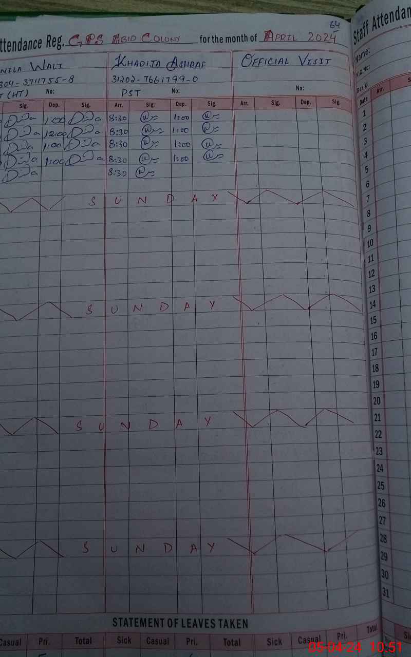 | CNIC | Full Name | Designation | R/C | Absence During Last Calender Month |