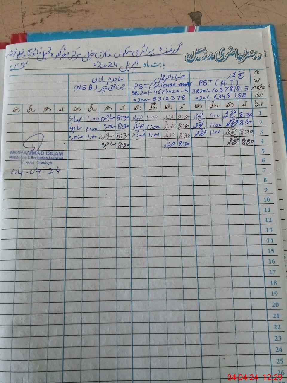 | Name: FA**** MU**** Designation: (School Headmaster's/Headmistress's) PST/PTC/JV Phone/Cell Number: 03**** |