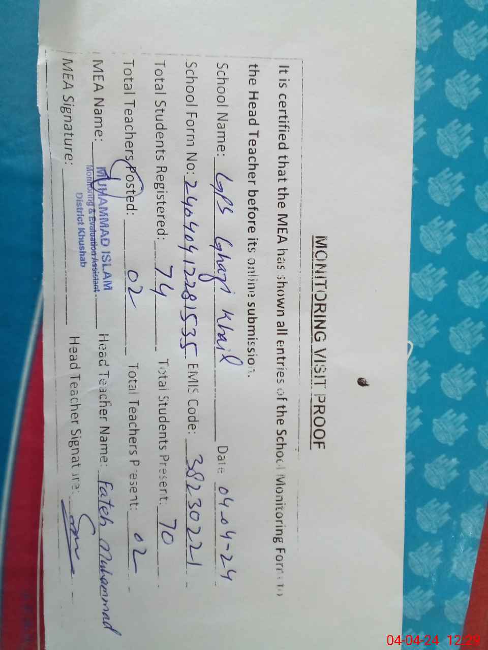 | Attendance Register | Head Teacher | MEA with School | Visit Proof |