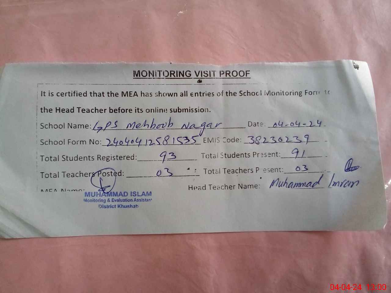 | EMIS Code: 38230239 | Name of School: GPS MEHBOOB NAGAR | |||