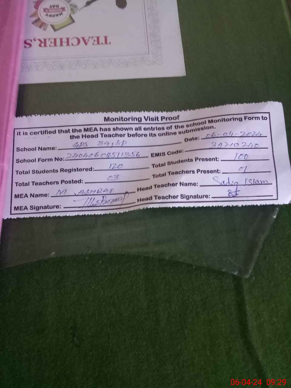 | EMIS Code: 39210240 | Name of School: GPS CHAK NO. 34 SP | |||