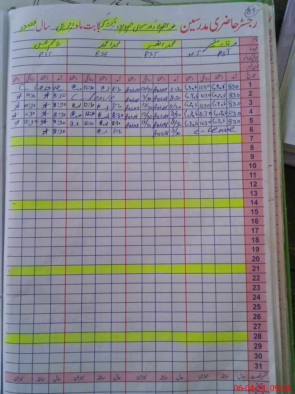 | CNIC | Full Name | Designation | R/C | Absence During Last Calender Month |