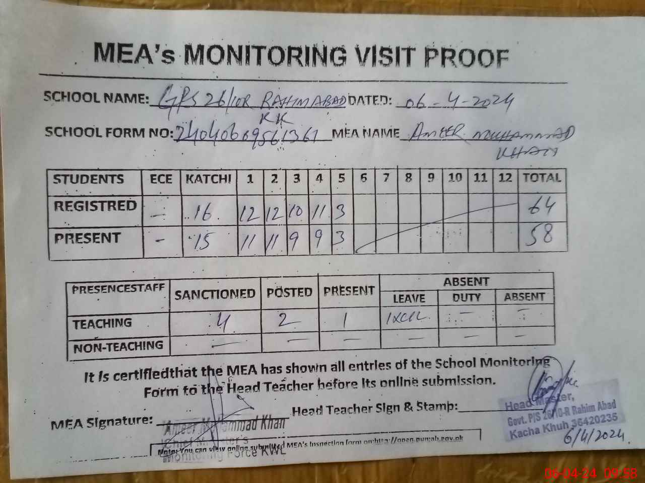 | Attendance Register | Head Teacher | MEA with School | Visit Proof |
