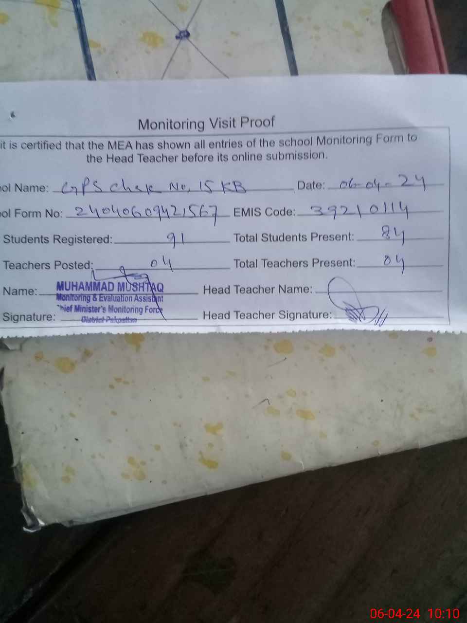 | EMIS Code: 39210114 | Name of School: GPS CHAK NO 15 KB | |||