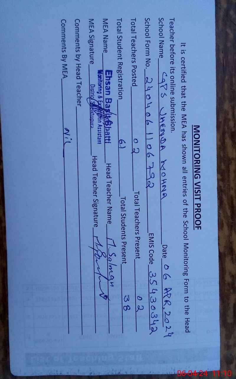 | EMIS Code: 35430342 | Name of School: GPS JHENDA KOHNA | |||