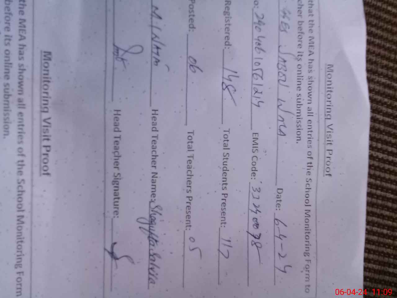 | Attendance Register | Head Teacher | MEA with School | Visit Proof |