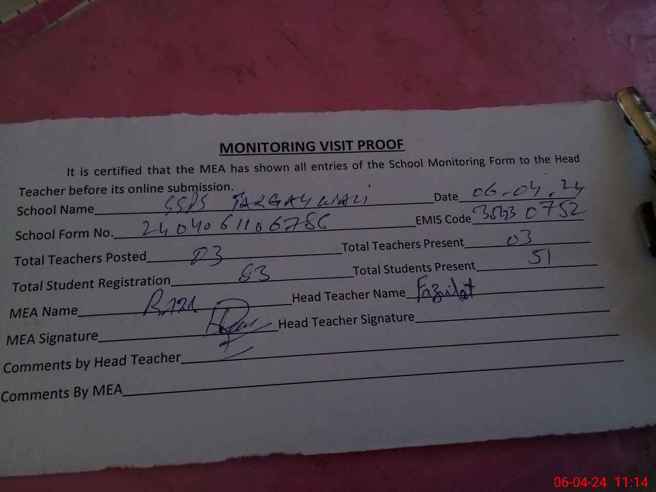 | Attendance Register | Head Teacher | MEA with School | Visit Proof |