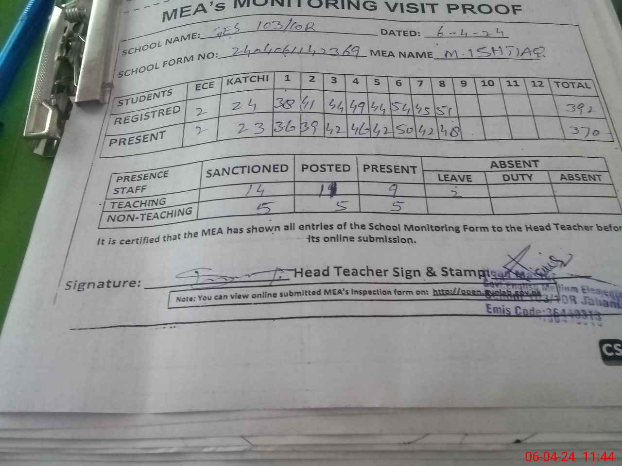 | Attendance Register | Head Teacher | MEA with School | Visit Proof |