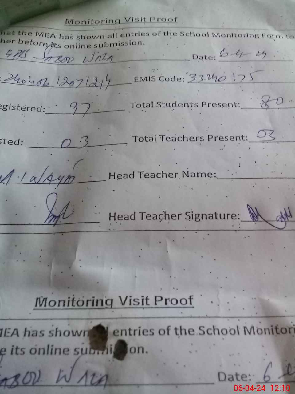 | Attendance Register | Head Teacher | MEA with School | Visit Proof |