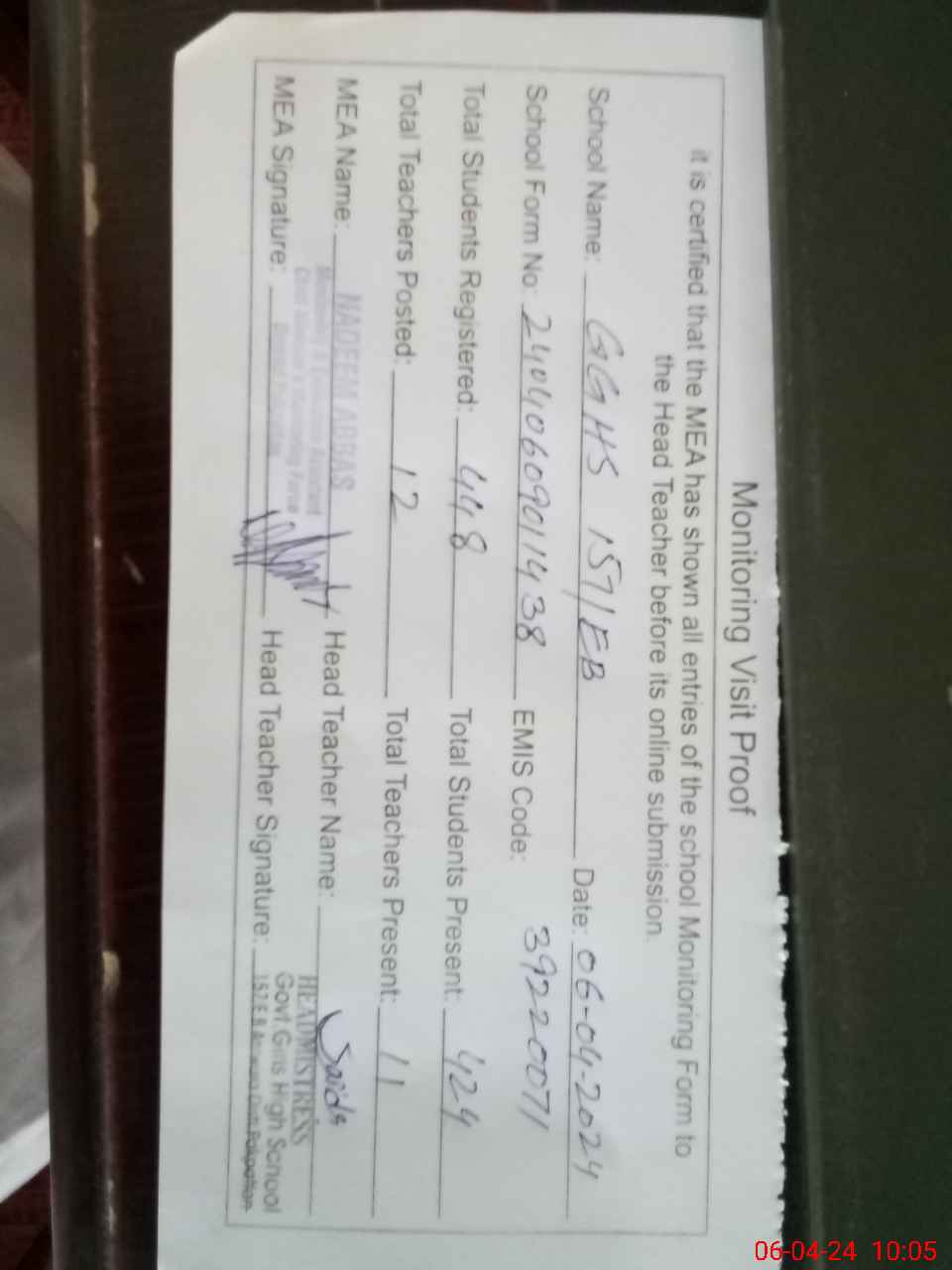 | Attendance Register | Head Teacher | MEA with School | Visit Proof |