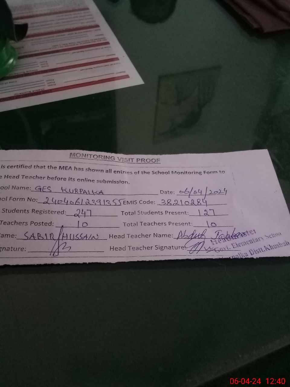 | Attendance Register | Head Teacher | MEA with School | Visit Proof |
