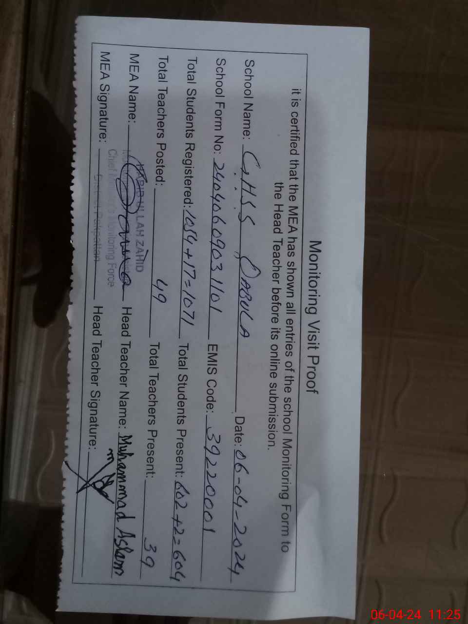 | Certified that this School was Inspected by the Undersigned MEA/DMO Today and the Information Stated Above is as Per Record. | |||||