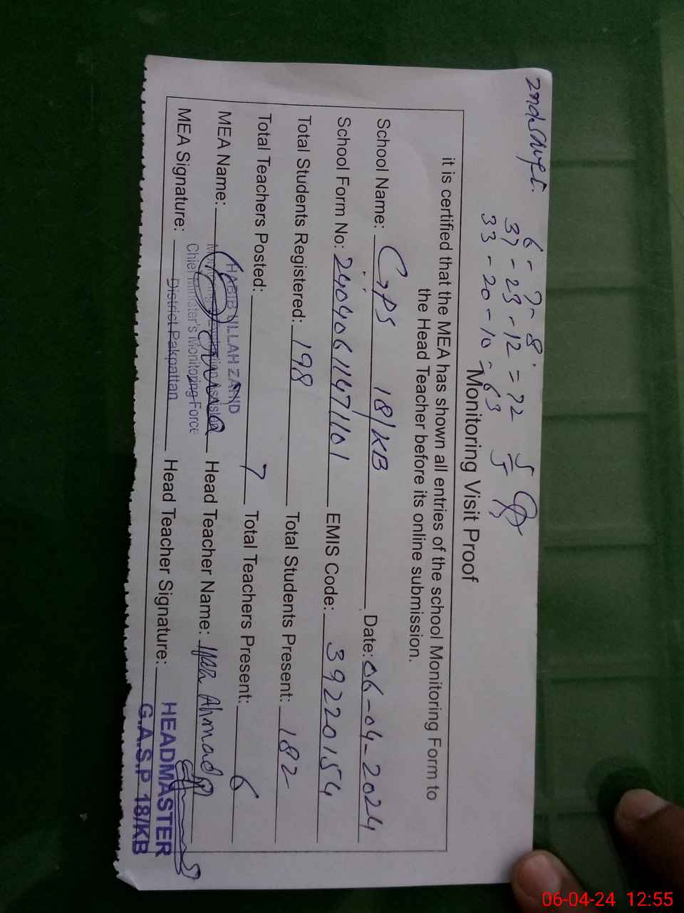 | EMIS Code: 39220154 | Name of School: GPS CHAK NO. 18 KB | |||