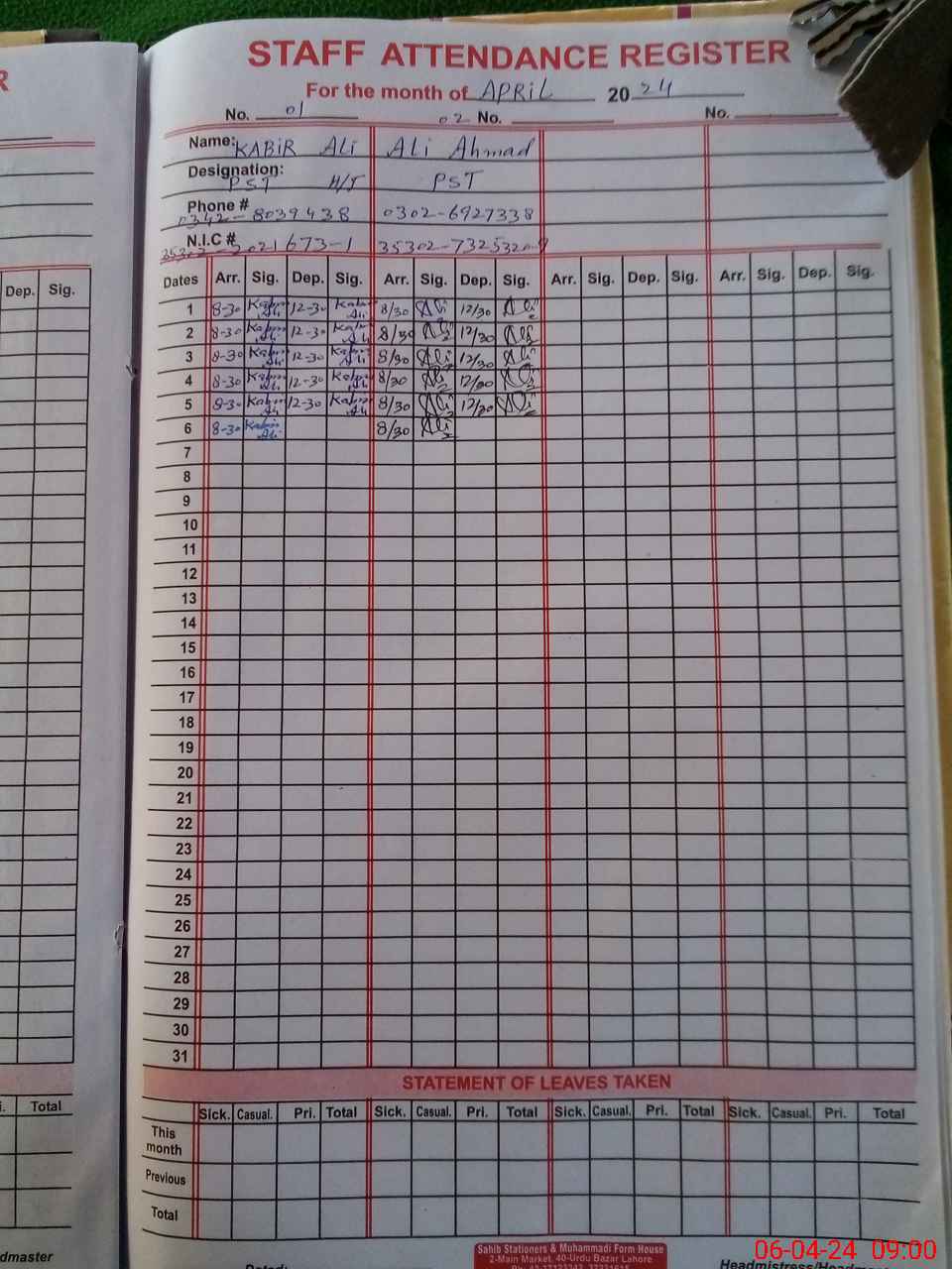 | CNIC | Full Name | Designation | R/C | Absence During Last Calender Month |