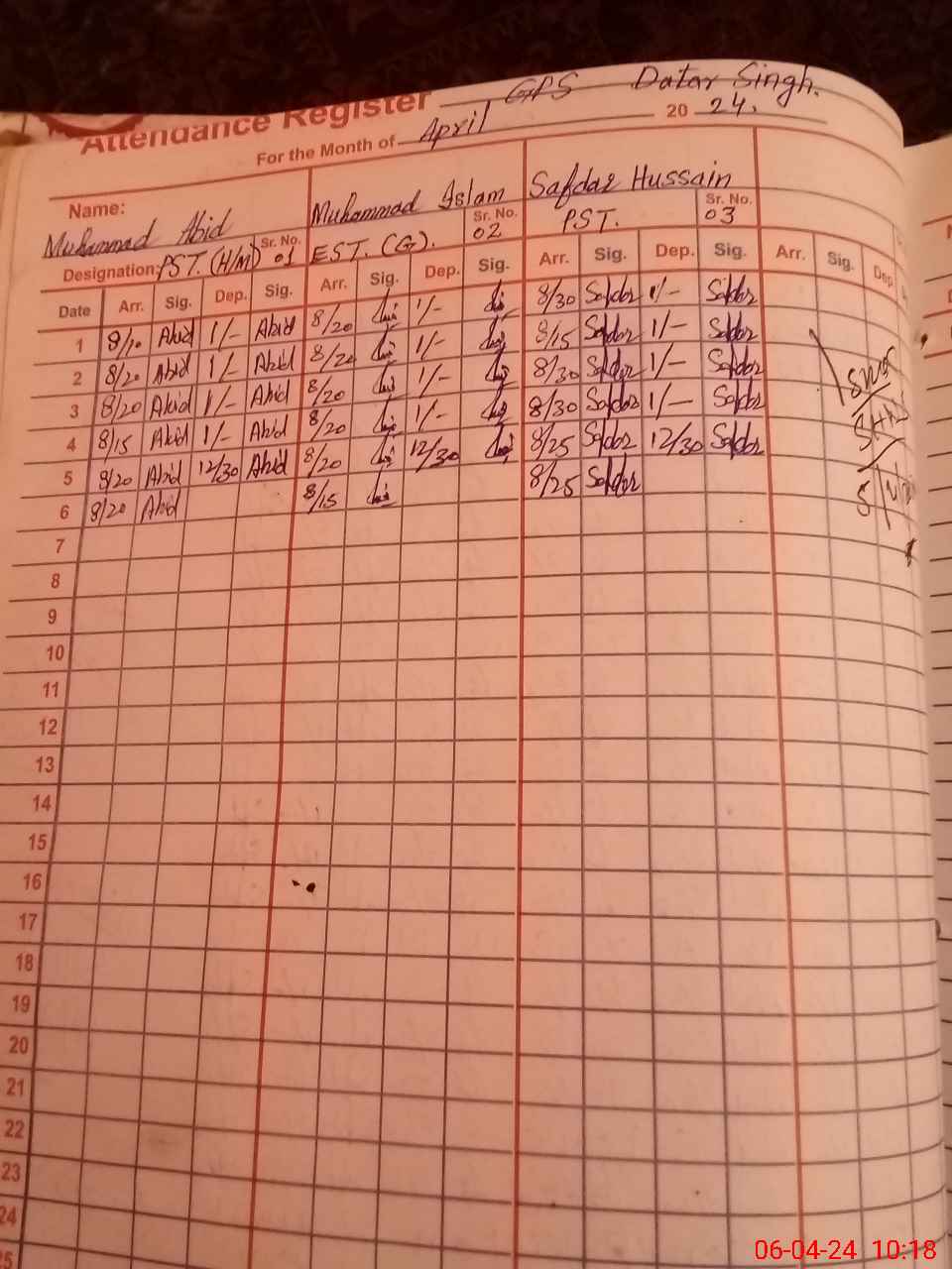 | CNIC | Full Name | Designation | R/C | Absence During Last Calender Month |