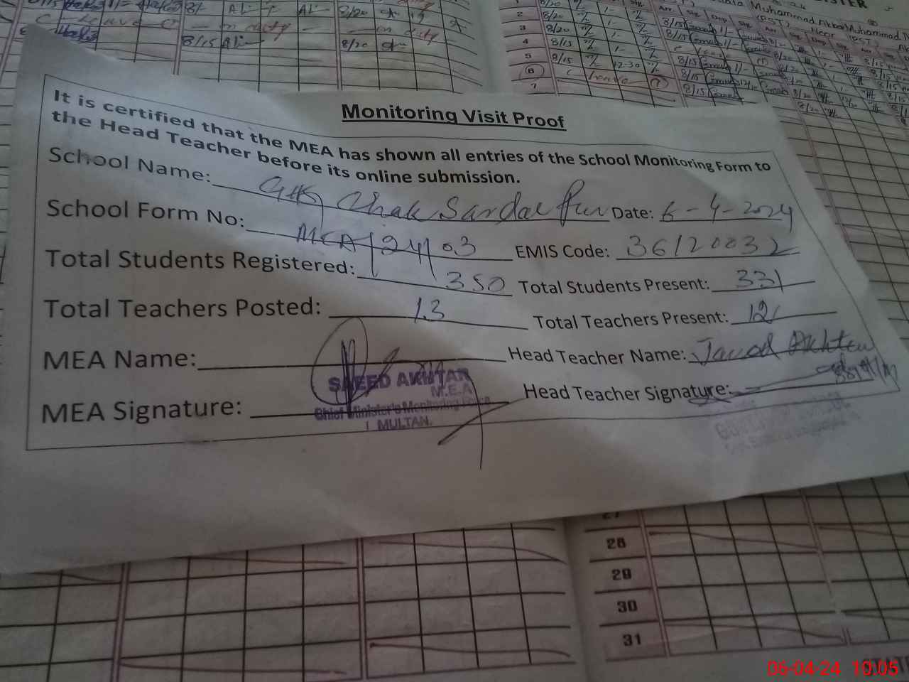 | Attendance Register | Head Teacher | MEA with School | Visit Proof |