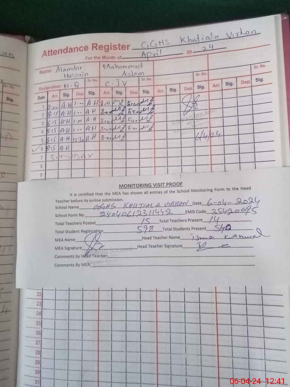 | Attendance Register | Head Teacher | MEA with School | Visit Proof |