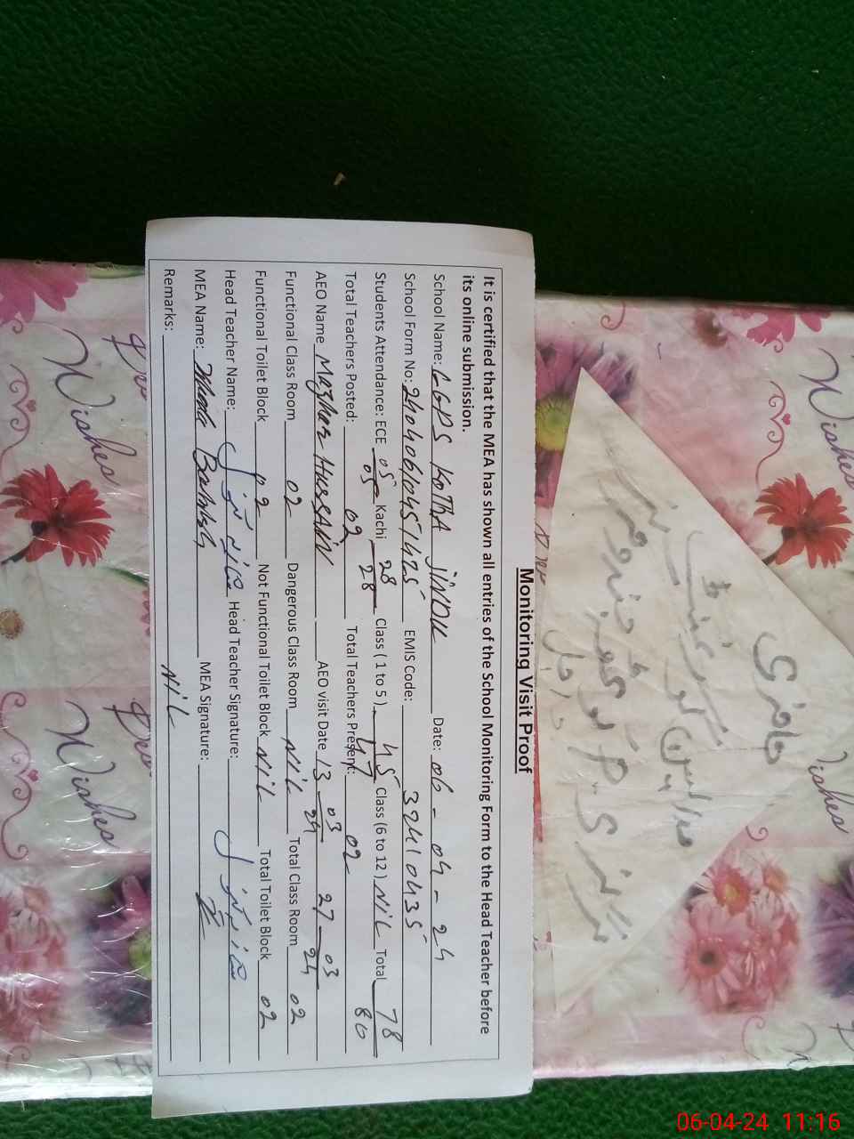 | Certified that this School was Inspected by the Undersigned MEA/DMO Today and the Information Stated Above is as Per Record. | |||||
