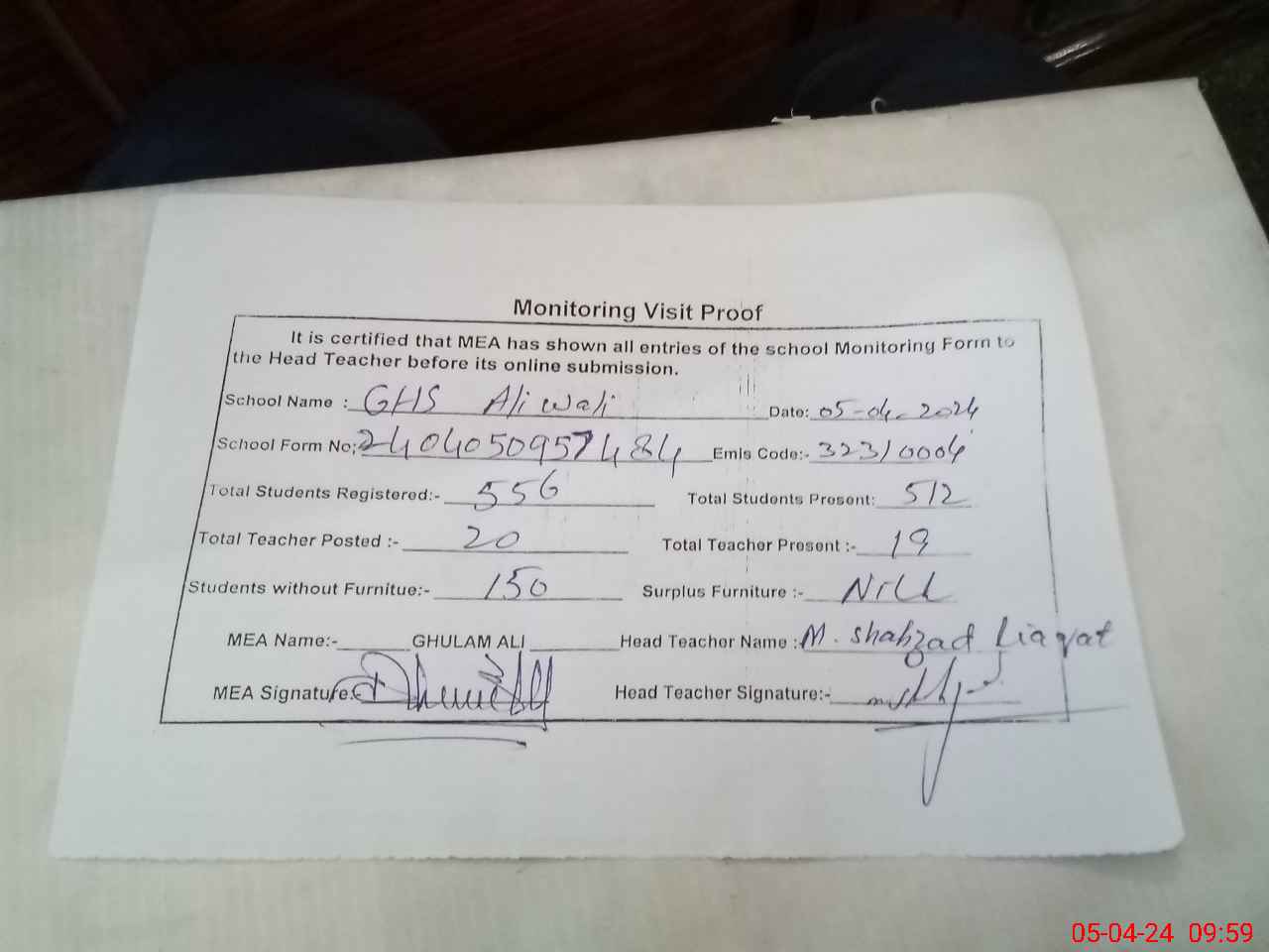 | Attendance Register | Head Teacher | MEA with School | Visit Proof |