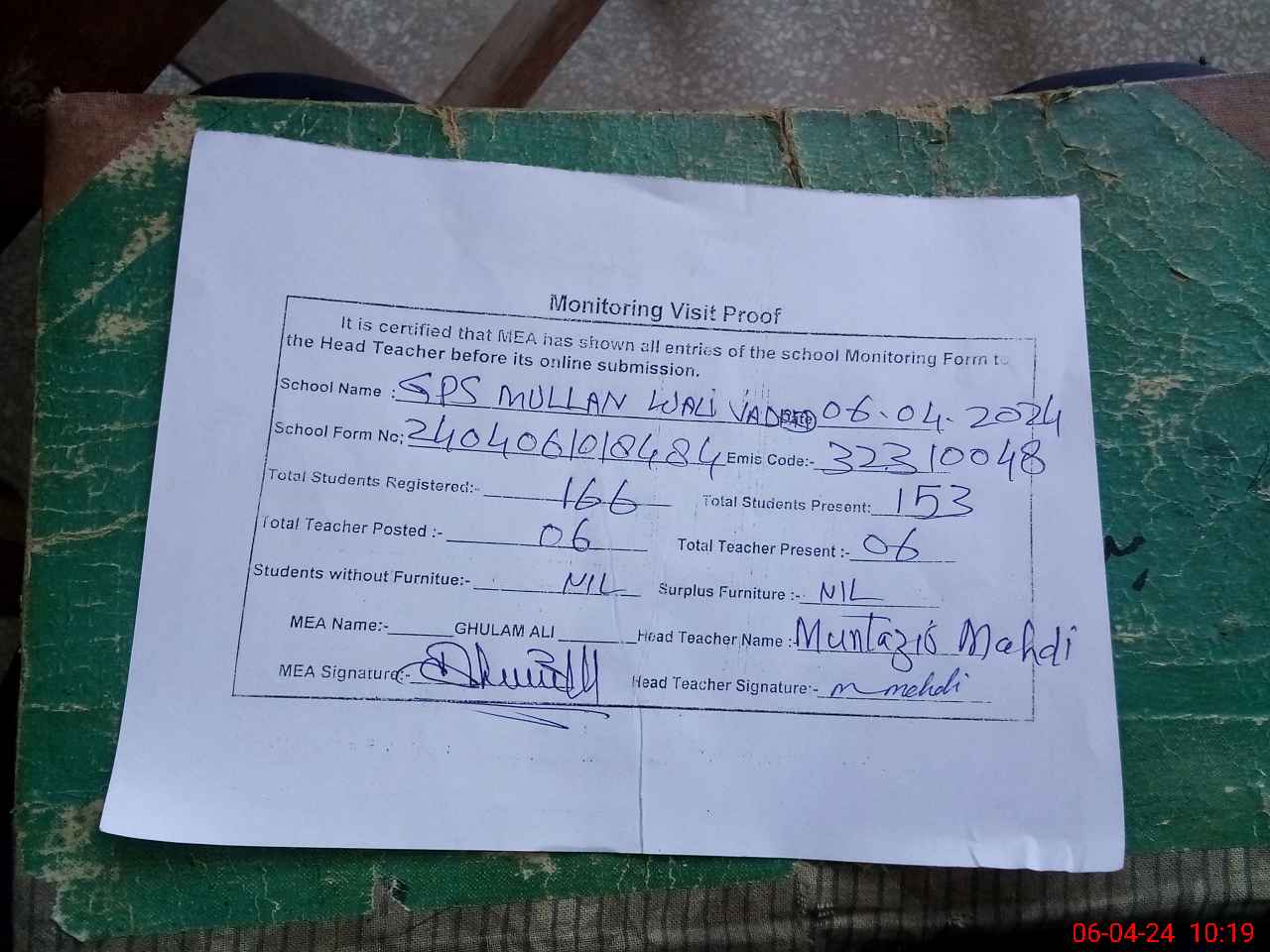 | EMIS Code: 32310048 | Name of School: GPS MULLAN WALI JADEED | |||