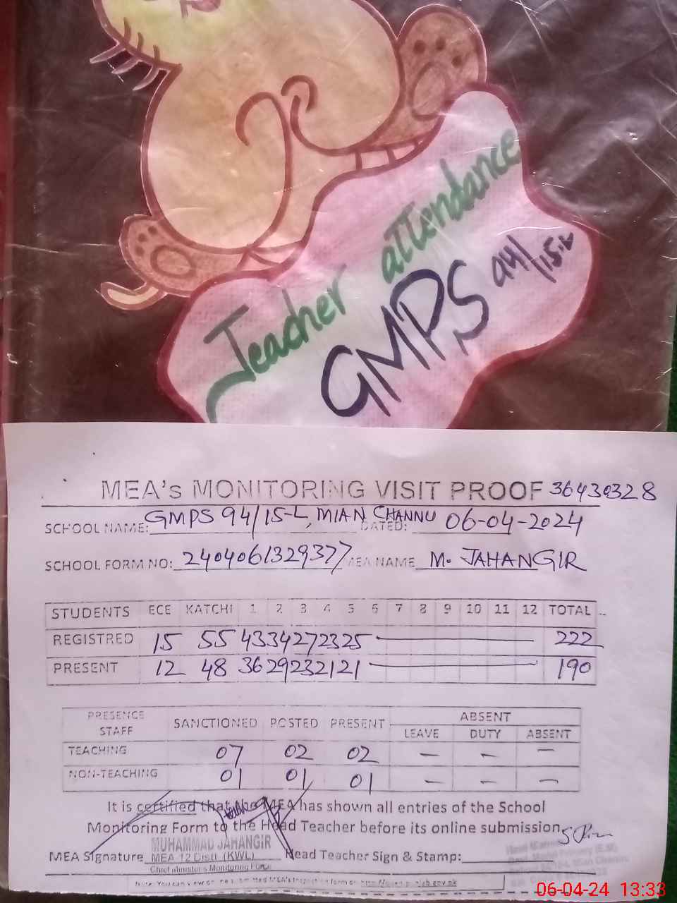 | EMIS Code: 36430328 | Name of School: GGPS 94/15-L, MIAN CHANNU | |||