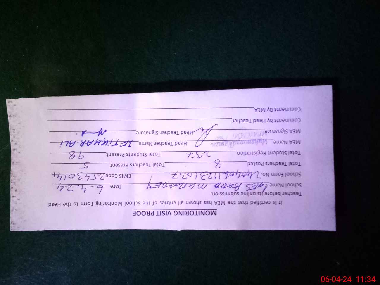 | Attendance Register | Head Teacher | MEA with School | Visit Proof |